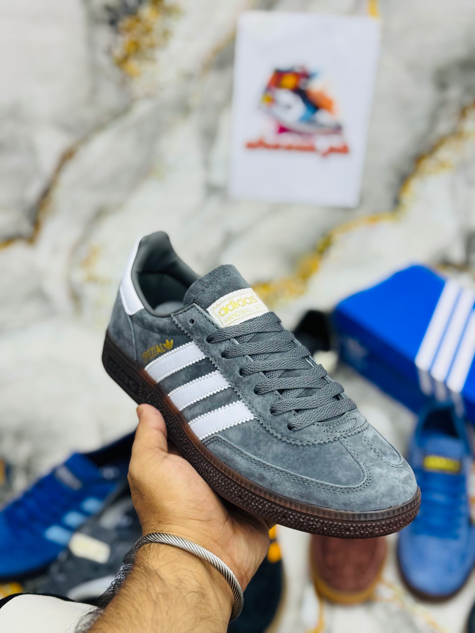 The Adidas Handball Spezial Shoes in blue and black are designed specifically for handball performance. These shoes offer a durable construction, ensuring long-lasting use, while the specialized grip enhances traction on indoor surfaces, promoting stability. Their lightweight design supports agility, essential for quick movements during play.
